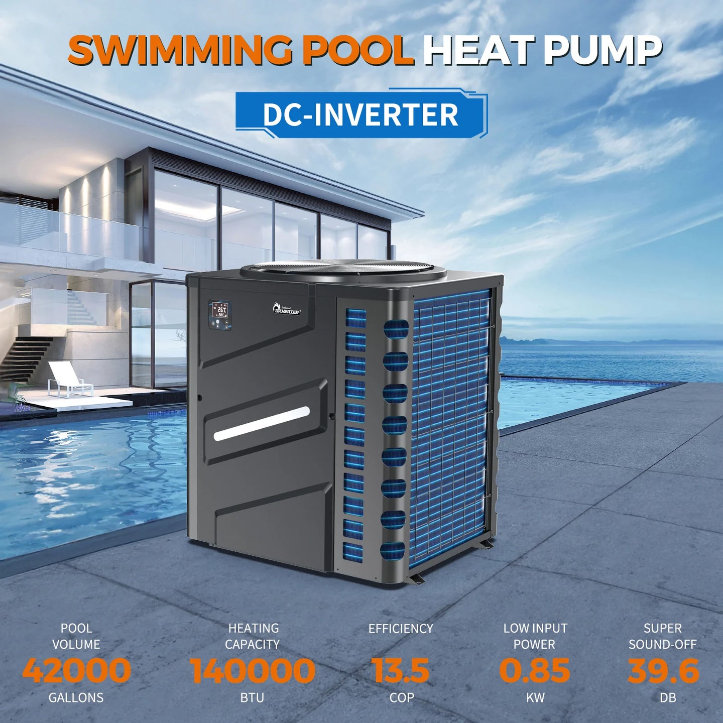 Dr. Infrared DR-1400HP 140,000 BTU Full Inverter Pool Heat Pump – Built For In-Ground & Above-Ground Pools – Includes 3 Year Whole Product Warranty